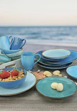 4 Speisetellern 27 cm, 4 Desserttellern 21 cm, 4 Mehrzweckbechern 16,5 cm und 4 Kaffeebechern 30 cl