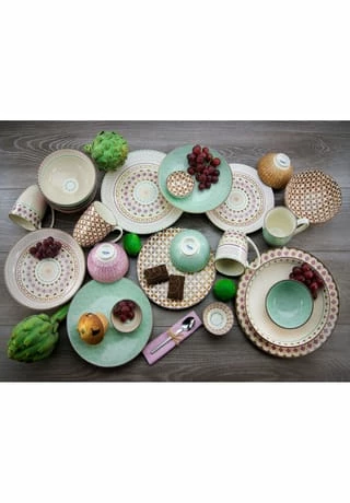 Traditionelle Motive aus dem asiatischen Raum. Verspielt und vollflächig dekoriert, die aufeinander abgestimmten Fraben bringen pure Lebensfreude zu Ihnen.
