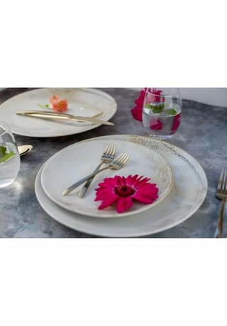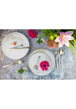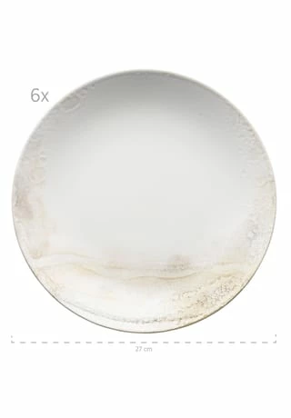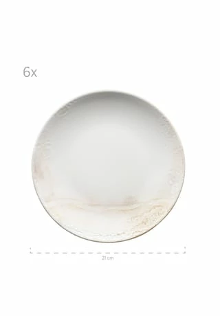 Herrlich duftender Waldgeruch, der Sie tief durchatmen lässt; aufblitzende Sonnenstrahlen, die immer wieder ihren Weg durch tanzende Blätter finden: Die Edition “Wooden Light” der Keramikgeschirr Kollektion “Ossia” bringt das unvergleichliche Gefühl der Entschleunigung aus der Natur auf Ihren Esstisch. Schlichte runde Coupe-Formen aus hochwertigem und robustem Steinzeug der österreichischen Traditionsmarke MÄSER, gepaart mit einem haptisch fühlbaren Dekor aus ineinanderfließenden Naturfarben – das ist das Geheimnis dieser Tafelgeschirr Kollektion, die mit viel Herzblut in Europa produziert wird. Die gesamte Serie “Ossia”, und selbstverständlich auch die Edition “Wooden Light”, ist dauerhaft spülmaschinen- und mikrowellengeeignet, und somit äußerst pflegeleicht. Dieses Set wird in einer vielfach auf Bruchsicherheit getesteten Postversandverpackung aus umweltfreundlichen Materialien versendet. Bitte beachten Sie: Um eine objektive Vergleichbarkeit zu gewährleisten, gehen unsere Füllmengenangaben von einer randvollen Befüllung aus. Dieses Set besteht aus: 6 x Essteller flach (Ø 27,5 cm) 6 x Teller tief (Ø 22 cm, 900 ml Füllmenge) 6x Kuchenteller (Ø 21 cm)