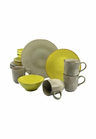 Hochwertiges Steingut in Antik-Optik. Das moderne Service für 4 Personen wirkt wie handgetöpfert und setzt sich wie folgt zusammen: Je 4 Speiseteller ca. 28 cm, 4 Dessertteller ca. 23,5 cm, 4 Kaffeebecher ca. 30 cl und 4 Müslischalen ca. 15 cm